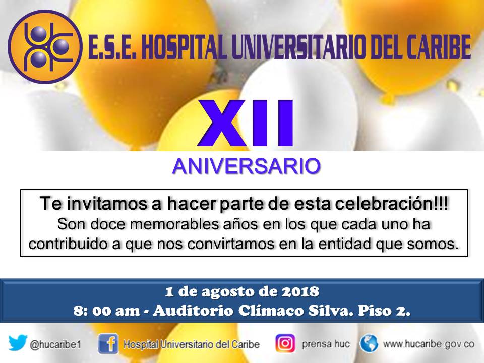 Están cordialmente invitados a conmemorar los 12 años de la ESE Hospital Universitario del Caribe. Los esperamos mañana 1 de agosto a las 8:00 p.m. en el Salón Clímaco Silva García, 2do piso del centro asistencial. ¡No faltes!